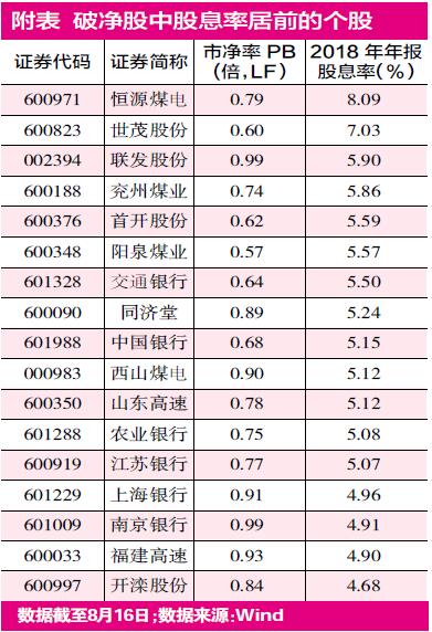 据记者了解,目前国有四大行一年的定存利率是1.95%和2.25%(以起存金而定),而筛选后可以发现,这些破净股中股息率超过一年定存利率1.95%的有76只,占破净股数量的比为21.05%,其中恒源煤电的股息率最高为8.09%(见附表)。对比国有四大行三年的定存利率(3.575%、3.85%和3.9875%),恒源煤电的股息率是它们的两倍有余。