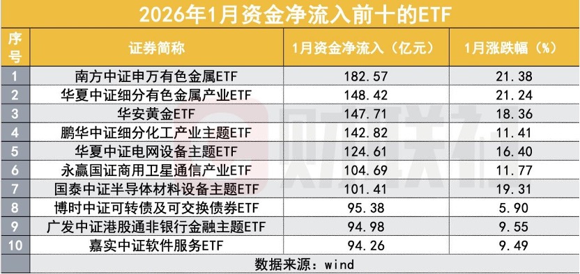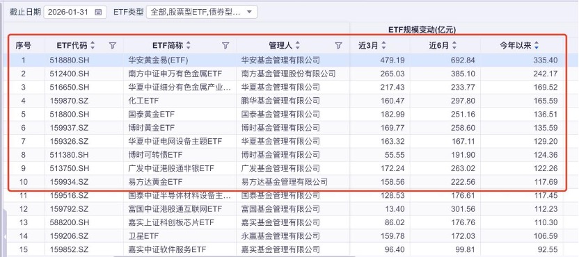 资金1月都买了谁?有色ETF、黄金ETF、化工ETF居前