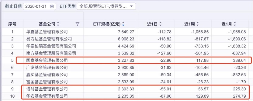 国泰基金、华安基金、博时基金规模增长排进前三,规模增长分别为352.63亿元、284.08亿元以及227.47亿元,原因上,黄金ETF扛大旗,细分领域也有亮点,比如国泰的半导体设备材料、博时的可转债ETF等。
