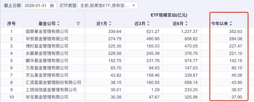 永赢基金1月ETF规模增加也超200亿元,黄金股ETF、卫星ETF均获得不少资金的买入。此外,旗下有化工ETF的鹏华基金、有色ETF的万家基金、恒生科技ETF的天弘基金、消费ETF的汇添富基金等基金公司规模增长居前。