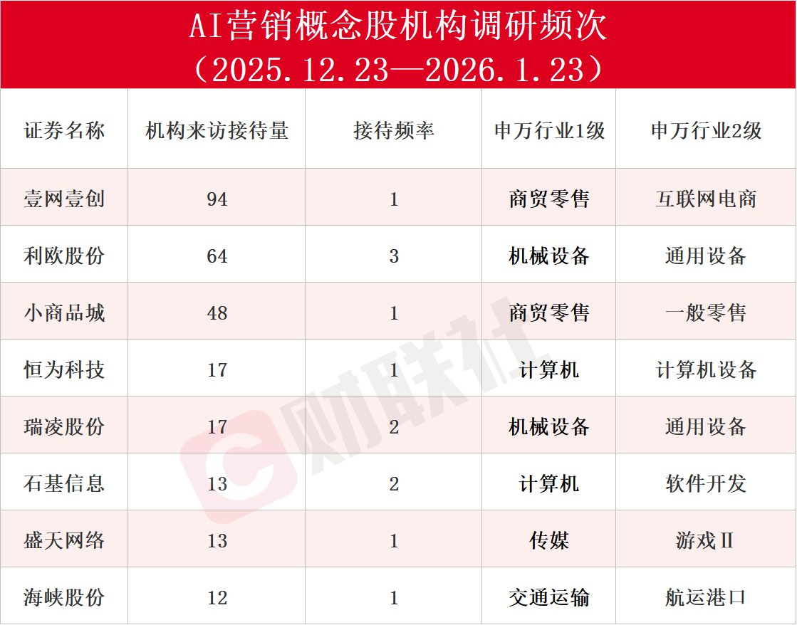 数据显示,在2025年12月23日-2026年1月23日期间获机构调研的AI营销概念股包括壹网壹创、利欧股份、小商品城、恒为科技、瑞凌股份、石基信息、盛天网络和海峡股份。具体情况如下: