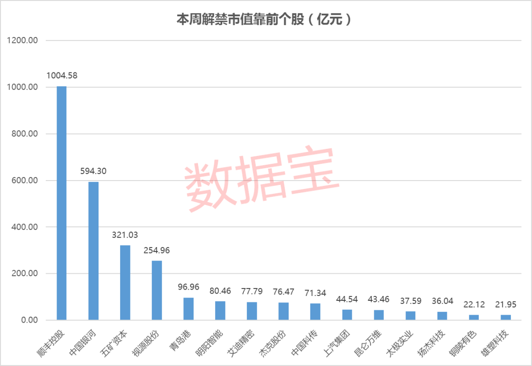 此外,本周解禁规模靠前的股票还有中国银河、五矿资本、视源股份,解禁市值都超过了200亿元。
