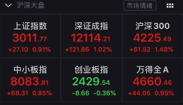7月1日,三大指数表现分化,白酒、房地产板块领涨市场。截至午间收盘,上证指数上涨0.91%,报3011.77点;深证成指上涨1.02%,报12114.21点;创业板指下跌0.36%,报2429.54点。上证指数时隔4个月重回3000点。