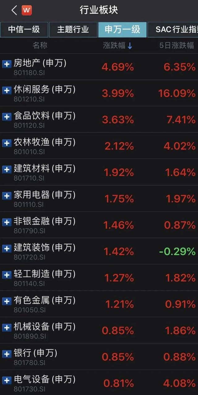 从盘面上来看,截至午间收盘,申万一级28个行业中,房地产、休闲服务、食品饮料行业涨幅居前,分别上涨4.69%、3.99%、3.63%;医药生物、国防军工、计算机行业跌幅居前,分别下跌0.59%、0.41%、0.34%。
