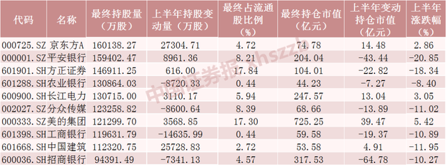 在个股持股量方面,Choice数据显示,截至上半年末,155只个股北向资金的持股量超过1亿股,其中京东方A、平安银行、方正证券、农业银行、长江电力、分众传媒、美的集团、工商银行、中国建筑等9股持股量超过10亿股。