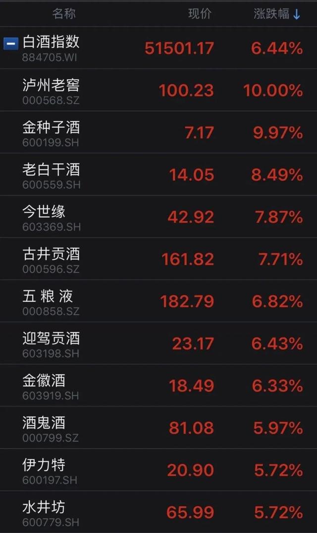 白酒板块中个股批量创历史新高,Wind白酒指数上涨6.44%,泸州老窖、金种子酒涨停,泸州老窖创历史新高,今世缘、古井贡酒、五粮液、酒鬼酒、水井坊、贵州茅台等均在盘中创下历史新高。其中贵州茅台股价盘中突破1500元,追上了飞天茅台酒的指导价1499元。