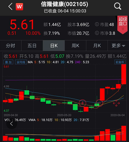 从事自行车车把、立管、坐垫管、避震前叉等自行零配件业务的信隆健康今日午后封住涨停,收盘报5.61元/股。