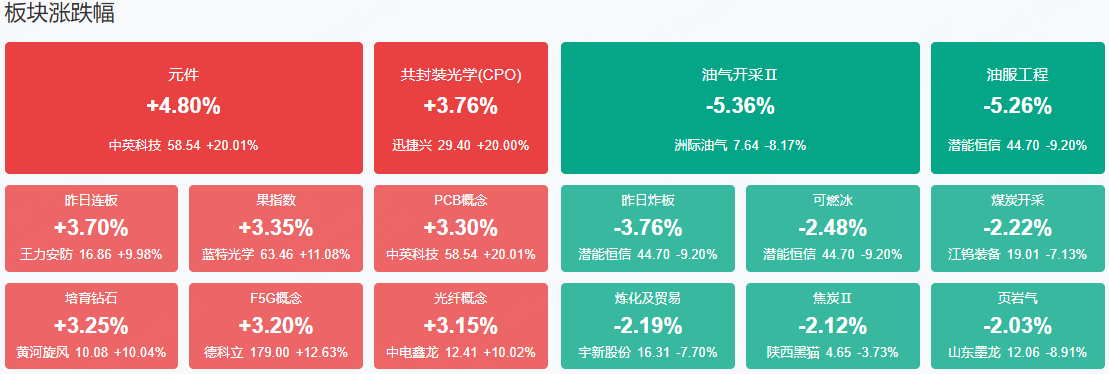 板块方面,光模块、消费电子、超硬材料、PCB、光纤等板块表现活跃,油气概念、煤炭、化工、贵金属等板块表现落后。截至收盘,沪指涨0.39%,深成指涨1.57%,创业板指涨2.47%。