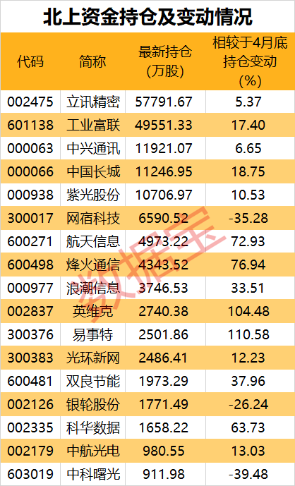 相较于4月底的持仓情况,易事特、英维克最新仓位已经翻倍,分别为2501.86万股、2740.38万股。此外,烽火通信、航天信息增持幅度逾70%。