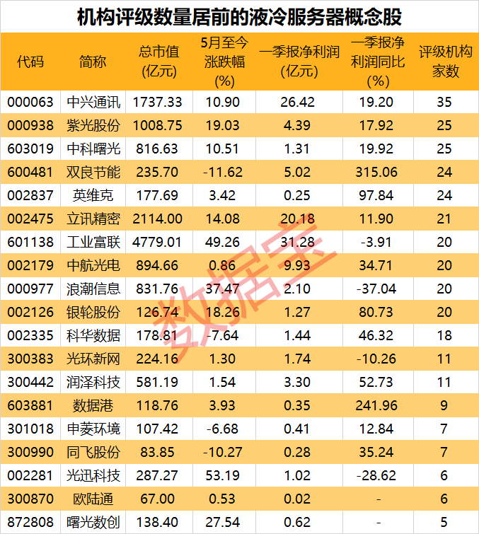 证券时报·数据宝统计,评级机构数量在5家及以上的液冷服务器概念股共计19股。中兴通讯居首,35家机构参评,公司此前在投资者活动中表示拥有液冷服务器相关产品。此外,紫光股份、中科曙光、英维克、银轮股份等近10股获20家及以上机构评级。