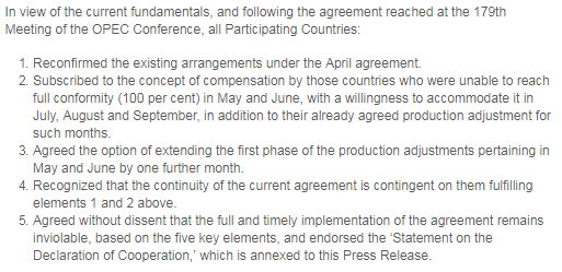公告称,会议注意到在6月,沙特做出进一步调整(100万桶/日)、阿联酋(100桶/日)、科威特(80桶/日)和阿曼(10-15桶/日),还有若干国家宣布资源调整、例如挪威和加拿大,以及不同石油公司下调生产计划和关闭供应的声明。