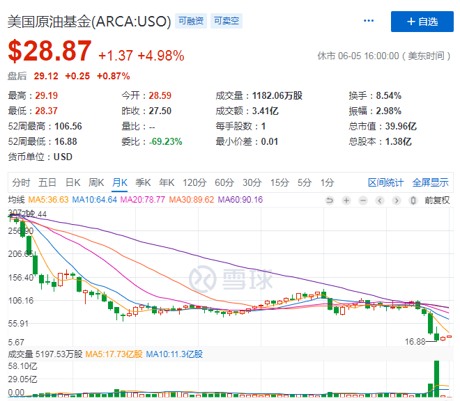 美国原油基金(USO)跟随原油价格大幅上涨,最新收盘报价28.87美元,涨幅为4.98%。自4月低点以来,已经连续两个多月反弹,累计涨幅超过60%。