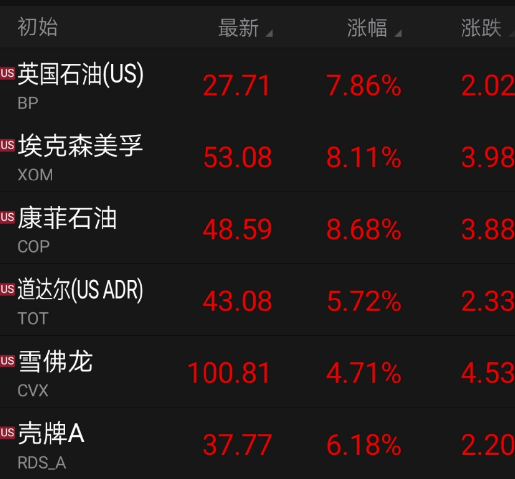上周五美股整体大涨,能源股表现尤其抢眼。主要能源股中,埃克森美孚、英国石油、康菲石油、斯伦贝谢涨幅均在8%左右,道达尔、雪佛龙、壳牌也都涨幅靠前。