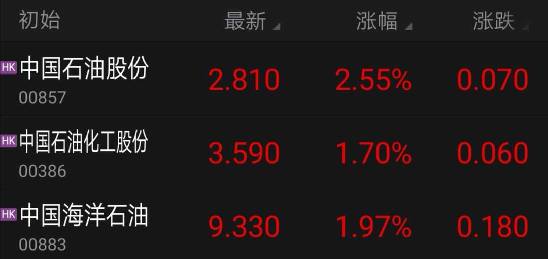 今日恒生指数开盘涨1%,升破25000点关口。“三桶油”走高,中海油涨超4%,中石油涨超2%,中石化涨近2%。