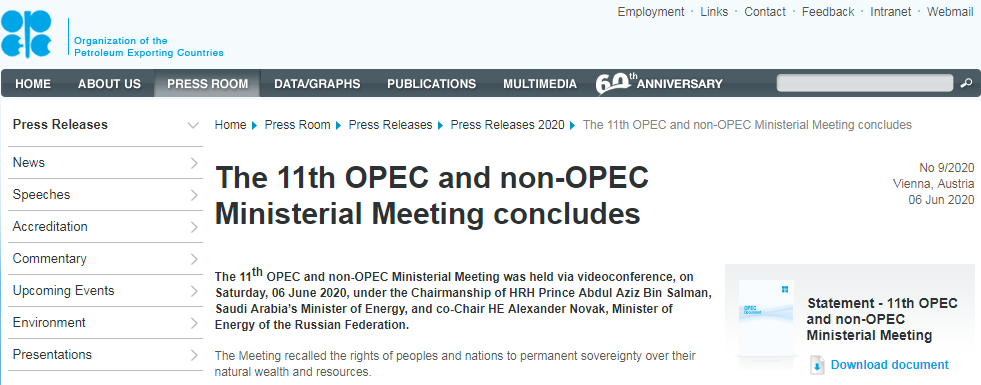 当地时间6月6日,第十一届欧佩克和非欧佩克(OPEC+)部长级会议通过视频会议方式举行,会后发布的官方声明显示,OPEC+同意将创纪录的减产规模延长至7月31日。