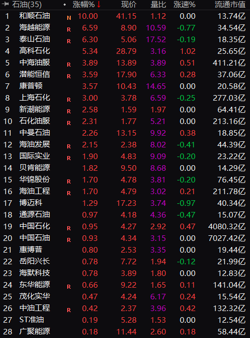 A股市场方面,石油板块涨幅居前,中石油和中石化涨幅近1%,和顺石油涨停,海越能源和泰山石油涨逾6%,高科石化涨逾5%,中海油服、潜能恒信、康普顿涨逾3%。