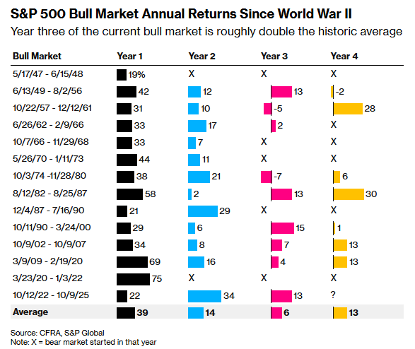华尔街资深人士、CFRA首席投资策略师Sam Stovall指出,二战以来的13轮美股牛市中,有7轮持续至了第四年,平均累计涨幅为88%。而本轮牛市仅用三年便基本达成此目标,并使标普500指数的市盈率达到25倍——创下了牛市第三年的历史最高纪录。