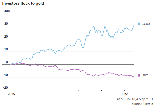 自4月份关税风波以来,对持久的“抛售美国”交易的担忧一直笼罩着全球市场,ICE美元指数上周五虽然小幅上涨了0.3%,但今年迄今为止仍比去年同期下跌了9.5%。不少业内人士表示,在以色列对伊朗发动袭击后美元兑主要非美货币仅温和上涨,进一步强化了美元作为全球避险货币地位正在削弱的迹象。