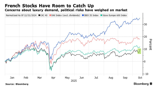 LVMH的财报利好与政治的积极进展,为CAC 40指数注入了亟需的活力。今年以来,该指数一直落后于德国DAX、西班牙IBEX 35等欧洲同类股指,主要原因是中国市场奢侈品需求疲软以及法国国内政局动荡。美国银行10月基金经理调查显示,法国曾是当时最不受青睐的欧洲市场。
