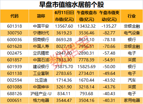 以开盘价来计算,A股总市值较前一日蒸发1.21万亿,中国人寿、中国平安、贵州茅台3股市值蒸发超过150亿。截至午盘收盘,上证指数跌幅收窄至0.38%,A股总市值较前一日蒸发3100亿,市值缩水较严重的有中国平安、宁德时代、招商银行等。