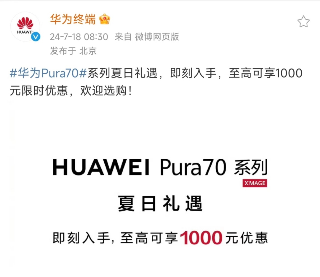 7月18日,“华为终端”官方微博宣布,Pura70系列推出500元到1000元的限时优惠。
