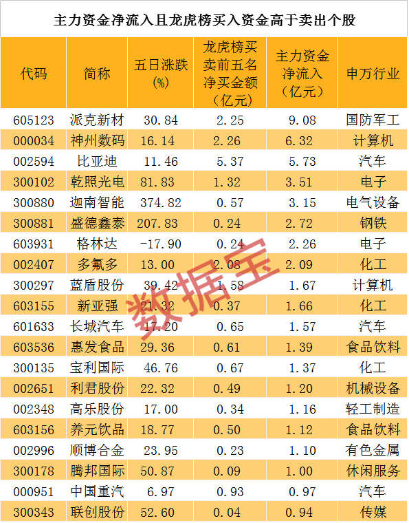 近五日龙虎榜机构或营业部净买入的106只个股中,主力资金同期净流入的个股有59只,净流入金额最大的个股为派克新材、神州数码、比亚迪,主力资金分别为9.08亿元、6.32亿元、5.73亿元。