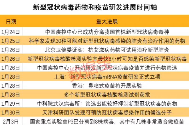 除了各级实验室,海内外医院和药企也正紧锣密鼓地研发疫苗。2月2日,泰国副总理宣称发现了治疗新冠肺炎的药方,治疗效果非常明显,有确诊病例服用完后,12小时内病情明显好转,48小时内检测结果变成阴性。