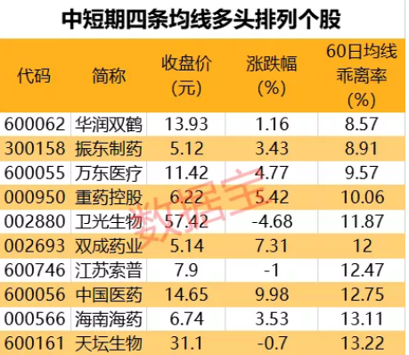 截至最新,77只个股5日、10日、20日、60日四条均线近日呈多头排列。其中华润双鹤、振东制药、万东医疗股价与60日均线的乖离率最小,分别为8.57%、8.91%、9.57%。