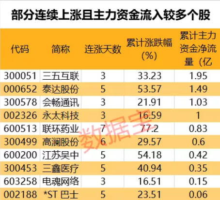 值得注意的是,22只连续上涨个股中,4只个股期间主力资金累计净流入超过亿元。其中,累计资金流入最多的为三五互联,主力资金累计流入1.95亿元。