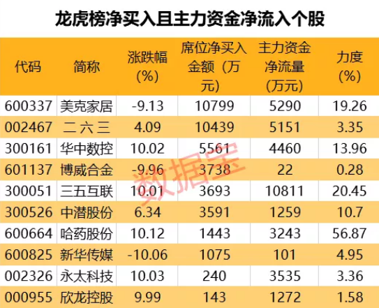 从盘口资金流向来看,主力资金净流入超千万且龙虎榜净买入个股共有8只,其中三五互联、美克家居、二六三等个股资金净流入金额最大。净流入力度最大的个股有哈药股份、三五互联、美克家居,净流入力度分别为56.87%、20.45%、19.26%。