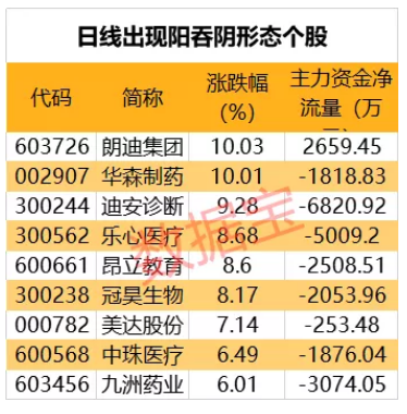 最新数据显示,两市共有20只个股日K线出现阳吞阴形态,当天涨幅最大的是朗迪集团、华森制药、迪安诊断,涨幅分别为10.03%、10.01%、9.28%。