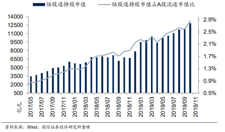而从国信证券整理的数据来看,2017年5月,陆股通持股市值占A股流通市值比例近1.3%,而截至2019年11月,该比例达到了2.9%。尽管在2018年下半年因A股指数的明显下滑之后,持股比例有小幅回调,但是总体仍然处于持续上升的趋势。