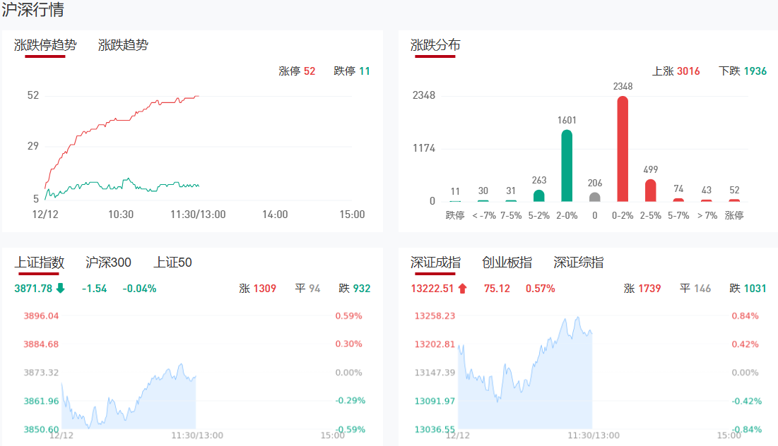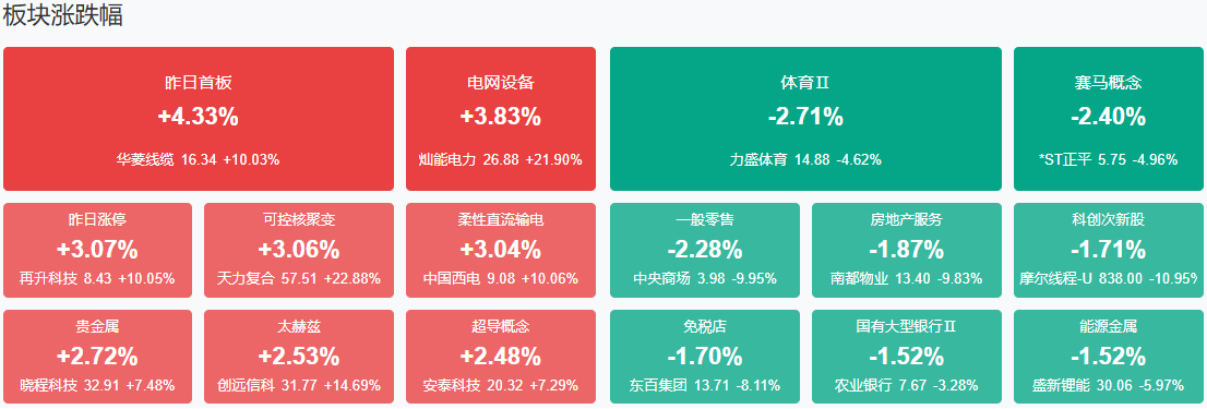 市场早盘探底回升,创业板指盘中涨超1%,此前一度跌近1%。沪深两市半日成交额1.24万亿,较上个交易日放量800亿。盘面上热点快速轮动,全市场超3200只个股上涨。从板块来看,商业航天概念延续强势,再升科技等十余股涨停。算力硬件概念表现活跃,联特科技20cm涨停。电网设备概念快速拉升,中国西电、中能电气等多股涨停。下跌方面,零售概念集体下挫,中央商场跌停。