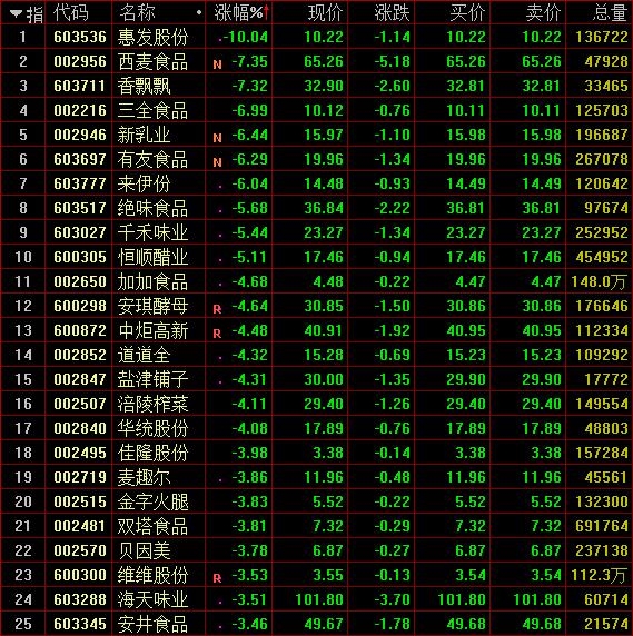 食品饮料股领跌,惠发股份尾盘跌停,香飘飘、西麦食品大跌逾7%,三全食品、有友食品、新乳业、绝味食品、来伊份等跌幅居前。酿酒板块走弱,兰州黄河、口子窖跌逾5%,金种子酒、今世缘、老白干、重庆啤酒等跌逾4%。
