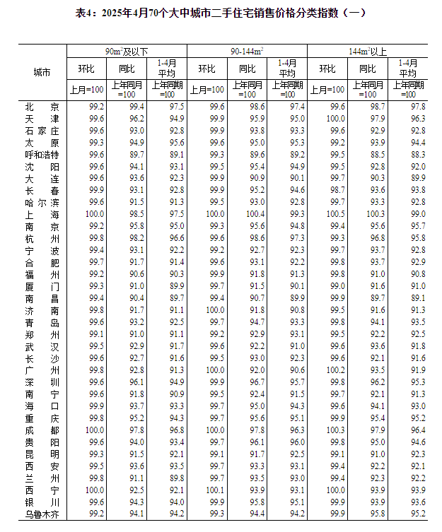 2025年4月份,70个大中城市中,各线城市商品住宅销售价格环比持平或略降,同比降幅均持续收窄。