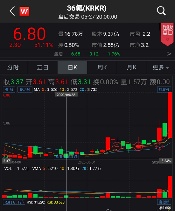 5月27日美股全线走高,在美上市中概股涨跌互现,其中,36氪领涨,截至收盘,36氪涨51.11%,报6.80美元/股。曾在4月28日,36氪盘中股价下探至3.31美元/股,如今在昨日涨幅的助攻下,36氪股价已经在1个月内实现翻倍。