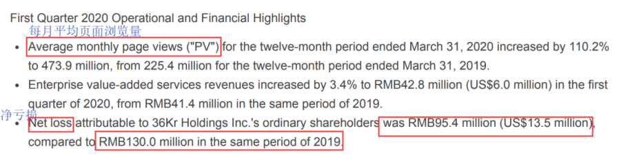 股价上涨总是有其内在逻辑,此次大涨前一日,36氪发布了2020财年的一季报。5月26日,36氪对外发布了2020财年一季报。财报显示,2020财年第一季度,36氪收入总额为人民币6520万元(约合美元920万元),去年同期收入总额为人民币8380万元。对于上市以来的首份一季报,36氪总结了三大亮点。