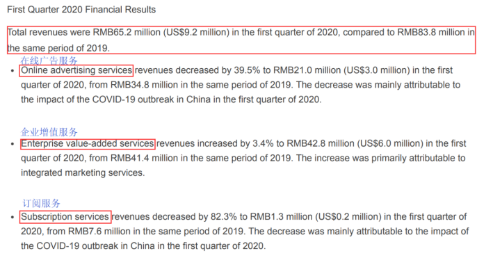按业务划分,在线广告服务营收2100万,同比降低39.5%,去年同期为3480万元。企业增值服务营收4280万元,同比增长3.4%。订阅服务营收130万元,同比降低82.3%,去年同期为760万元。对于在线广告服务和订阅服务收入的下降,36氪在一季报中归因于今年一季度的新冠肺炎疫情爆发。