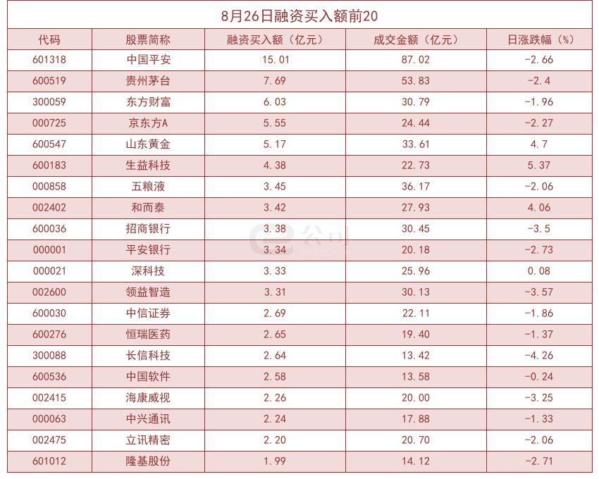 从融资资金买入金额来看,共有71只个股买入金额超亿元,其中中国平安(15.01亿元)、贵州茅台(600519)(7.69亿元)、东方财富(300059)(6.03亿元)居前三位。