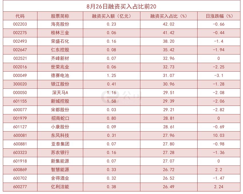 个股方面,沪深两市共有1600只个股有融资资金买入。从融资买入额占当日总成交金额比重来看,共有86只股票融资买入额占比超20%,其中海亮股份(002203)(42.02%)、桂林三金(002275)(41.42%)、荣盛石化(002493)(38.20%)排名前三。