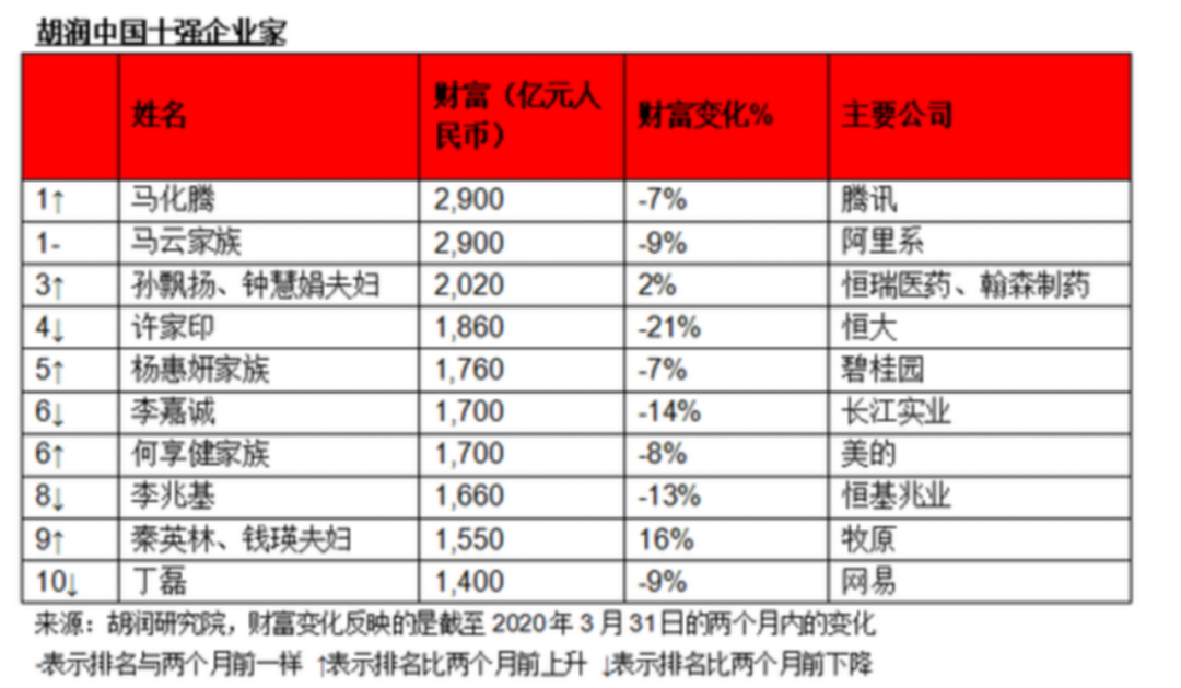 据胡润研究院4月6日发布的《疫情两个月后全球企业家财富变化特别报告》,截至2020年3月31日,马化腾与马云家族以2900亿元人民币的财富并列中国首富。