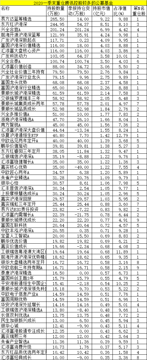 截至今年一季末,共有154只基金重仓持有腾讯控股,合计持股3383万股,环比增加超过一倍,显示基金大举加仓了腾讯。一季末这些基金重仓持股腾讯市值达117.53亿元。易方达蓝筹精选、东方红沪港深、兴全合宜等知名基金重仓持股最多,分别达265.5万股、244.95万股和201.24万股,不少基金将腾讯配置到第一大重仓股,可见对其价值的认可。像广发科技动力等基金更是顶格重仓,持股市值达净值的10%。