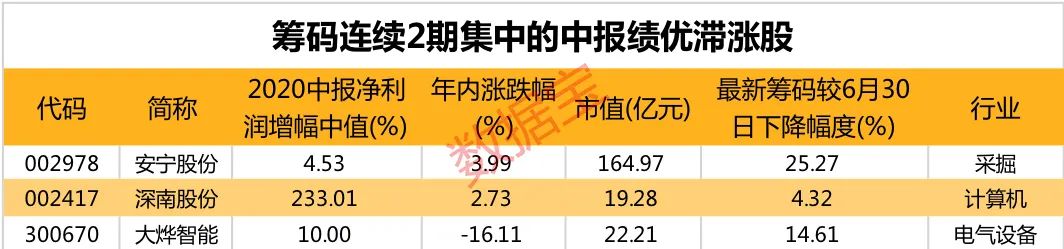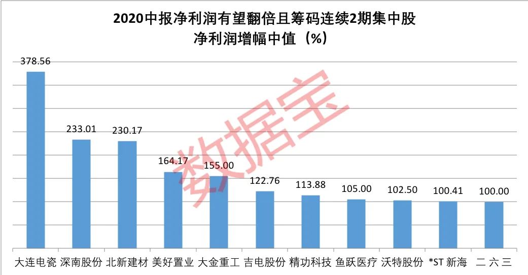 业绩扭亏的同时,*ST新海的最新股东户数更是连续3期趋于集中。*ST新海并非孤例,证券时报·数据宝统计显示,截至最新收盘日,筹码连续2期趋于集中(7月20日、7月10日、6月30日),上市超过3个月且中报净利润实现增长股仅有21只,而筹码连续3期集中股有9只。