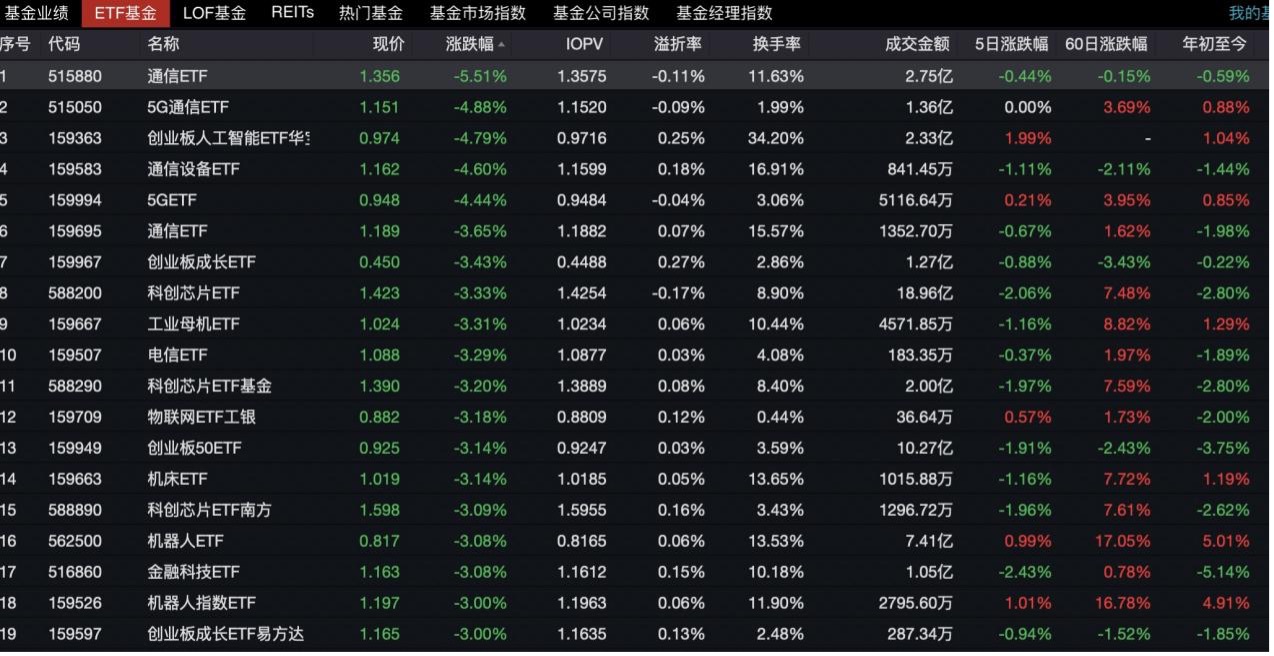 而受AI硬件端,受DeepSeek利空算力疑虑显著回调。截至收盘,通信ETF、人工智能ETF、芯片ETF等跌幅居前。以通信ETF为例,跌幅超过5.51%。