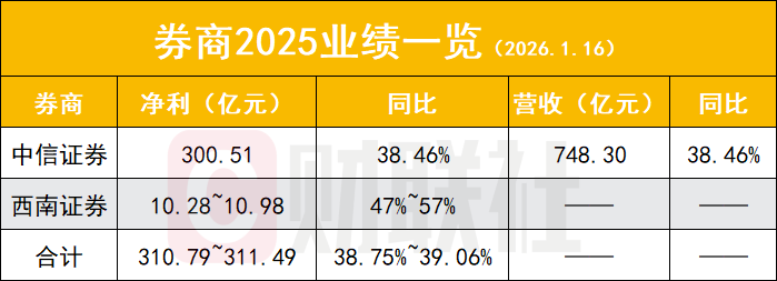 1月14日,行业龙头中信证券率先披露业绩快报,2025年公司营收规模达748.30亿元,同比增长28.75%;归母净利润高达300.51亿元,同比增幅达38.46%。