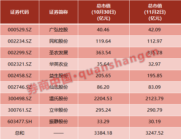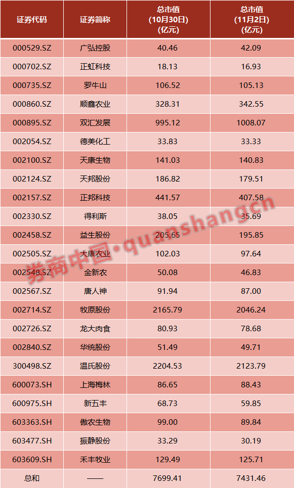 由于猪肉和鸡肉高位杀跌,此前一直上涨的两大板块的股票也连跌三天。据WIND数据,猪产业个股市值蒸发260余亿元。