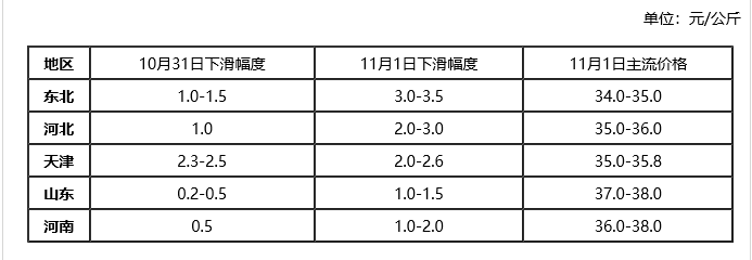 在此之前的11月1日和10月31日,由于北方冻品集中大量出货,对市场冲击较大,加之养殖端出栏积极性提升,屠企收购难度明显降低,生猪价格已经连续两日下滑,降幅分别在1~1.2元和0.5~1元之间。其实,在10月30日,市场整体的价格就出现了松动,当日东北、华北和山东的生猪价格都有一定程度下滑,其他地方以稳为主。