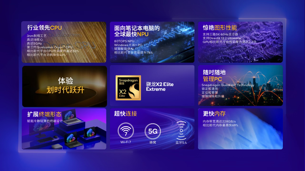 当日,高通还推出了骁龙X系列产品组合中的全新一代顶级平台,骁龙X2 Elite Extreme和骁龙X2 Elite。凭借卓越性能、多天电池续航和开创性AI,这两款全新处理器成为目前最快、性能最强大、能效最高的Windows PC处理器。