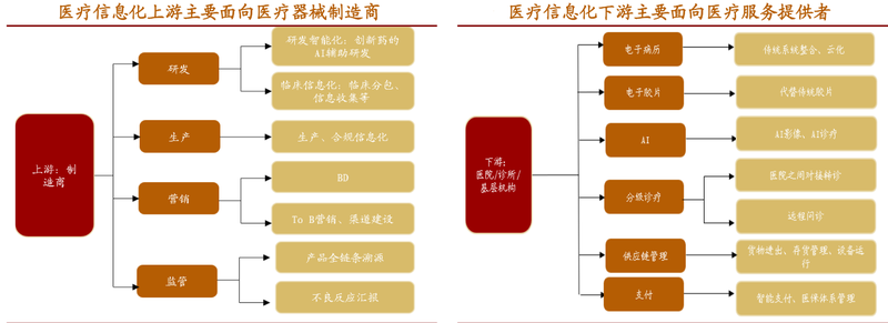 根据医疗信息化贯穿医疗健康的流程,可以将医疗信息化产业链分大致为两个部分。上游主要面向医疗器械制造商,主要包括医药产品、器械的研发、生产、营销和监管;下游主要面向医疗服务提供者医院、基层机构诊所等,包括病历管理信息化、AI 影像、AI诊疗、分级诊疗、供应链管理和医保支付体系等。