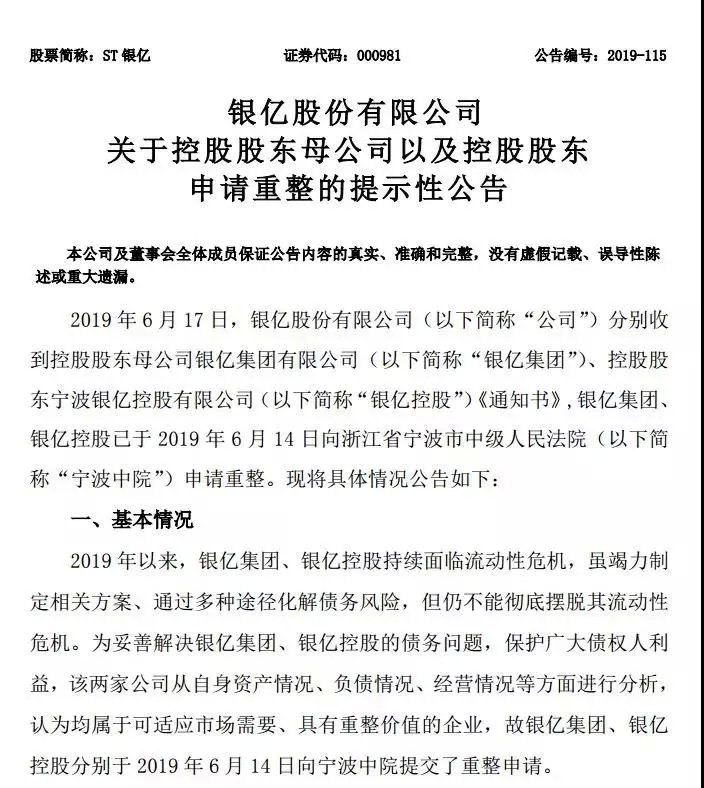 公告称,收到控股股东母公司银亿集团、银亿控股《通知书》,银亿集团、银亿控股两家公司已于6月14日向浙江省宁波市中级人民法院申请重整。